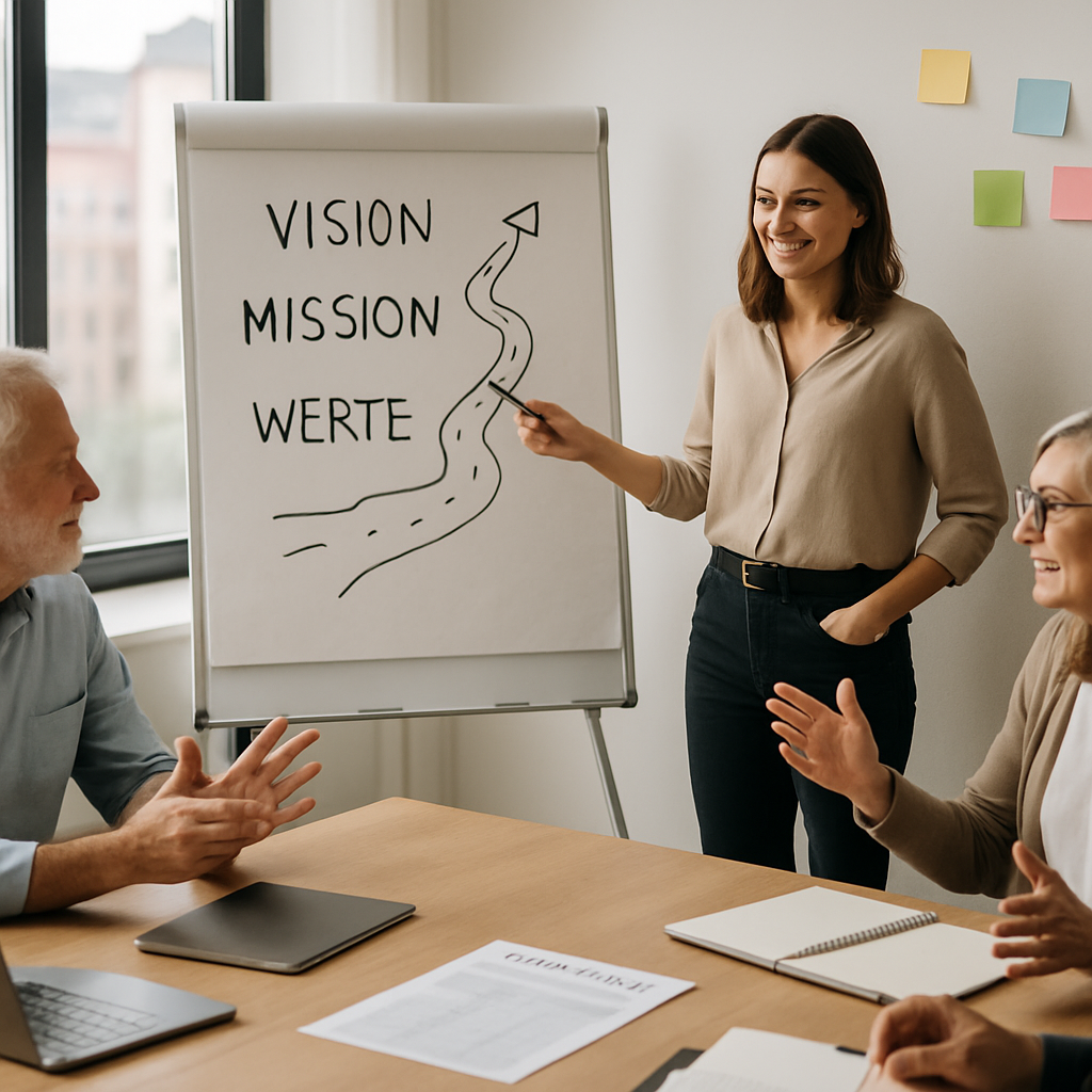 Kurz gefasst: Die Vision beschreibt das langfristige Zukunftsbild Ihres Unternehmens — wohin Sie wollen. Die Mission erklärt den Zweck und das tägliche Handeln — was Sie tun und für wen. Werte sind die Prinzipien, die das gewünschte Verhalten im Alltag vorgeben. Gemeinsam bilden sie das strategische und kulturelle Fundament, das Entscheidungen, Prioritäten und Kommunikation steuert.